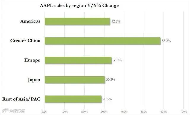 iPhone销售额为395.7亿元,同比增长49.78%,高于分析师预计的340.1亿美元;Mac销售额为82.4亿美元,同比增长16%,高于分析师预计的80.7亿美元;iPad销售额为73.7亿美元,同比增长12%,高于分析师预计的71.5亿美元;可穿戴设备、智能家居等配件销售额为87.6亿美元,同比增长40%,高于分析师的78亿美元。