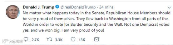 “不管今天在参议院会发生什么,共和党众议员们都应该为自己感到骄傲。他们从世界各地飞回华盛顿,为边界安全和边境墙投票。没有一个民主党人投了赞成票,但我们大获全胜。我为你们感到骄傲!”