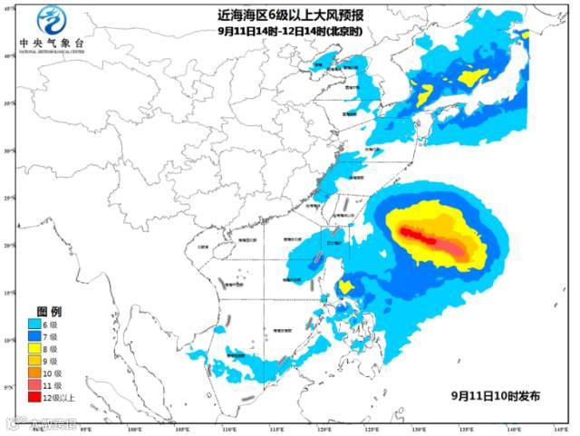 11日14时至12日14时,渤海将有4~6级、阵风7级的东北风,渤海海峡、黄海大部海域将有4~6级、阵风7级的西北风或偏北风,东海东北部海域将有5~7级、阵风8级的西南风,巴士海峡、南海东北部和中东部海域将有5~7级、阵风8级的东北风。