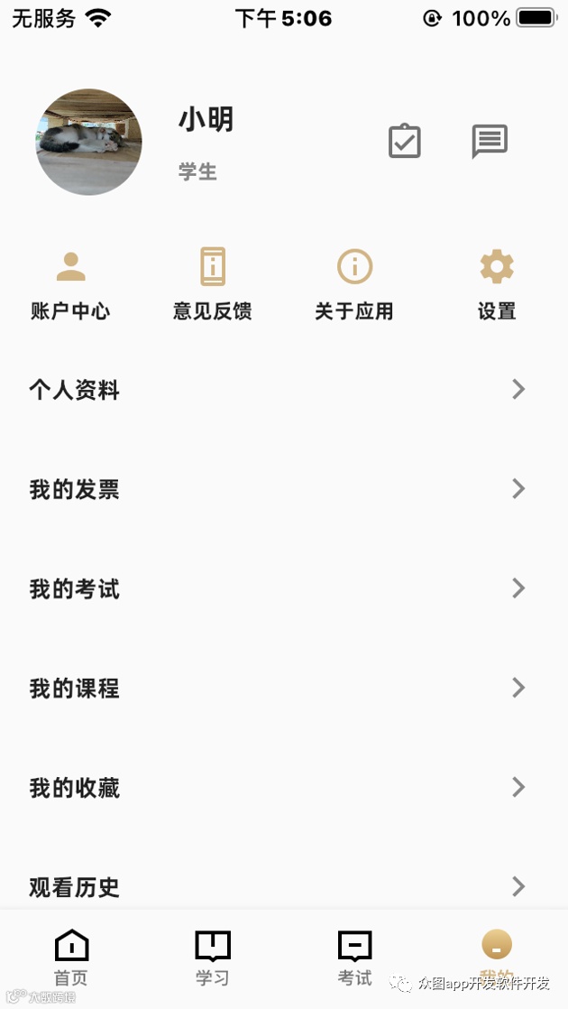 我的:提供了完善的个人信息、设置、反馈、打卡、消息等多项功能。也包括了购买的课程,发票管理,课程考试,课程收藏,观看历史等多种的复合功能区。