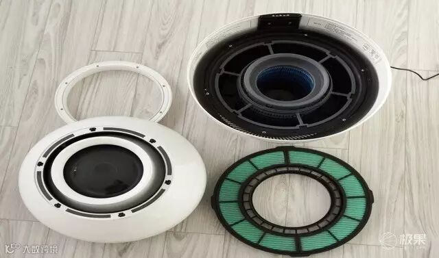 Rain有三层过滤功能,分别是溶菌酶滤网、加湿滤网、银离子环。溶菌酶滤网覆盖在供水罐上方,用于去除进风中的灰尘、细菌和杂质颗粒等。加湿滤网位于供水罐中央,用于过滤水中的杂质,并产为流过的空气加湿。银离子环位于供水盆底部中央,其作用是抑菌抗菌,保持供水盆内水质的鲜活阻止粘液的产生。为了能够更清楚地感受其工作原理,我们把各个模块做一个拆解展示: