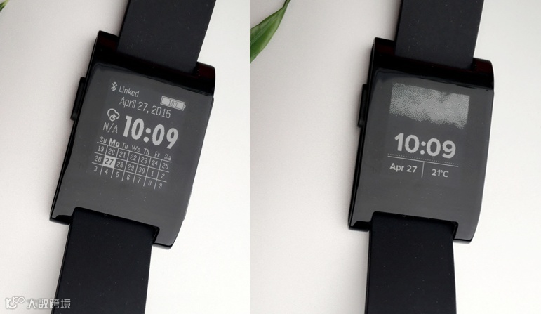 这两个表盘是笔者自行下载的,左边的可以显示日历,右边的可以显示实时温度。像这种有意思又实用的表盘Pebble商店里有很多。