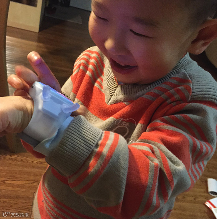 打开包装盒,看到糖猫手表外观,开心小朋友就被这只蓝色的有耳朵的表吸引,虽然他已有很多只不同的手表,但糖猫的这只够大,看上去更像玩具,所以还是表现出非常兴奋的样子。