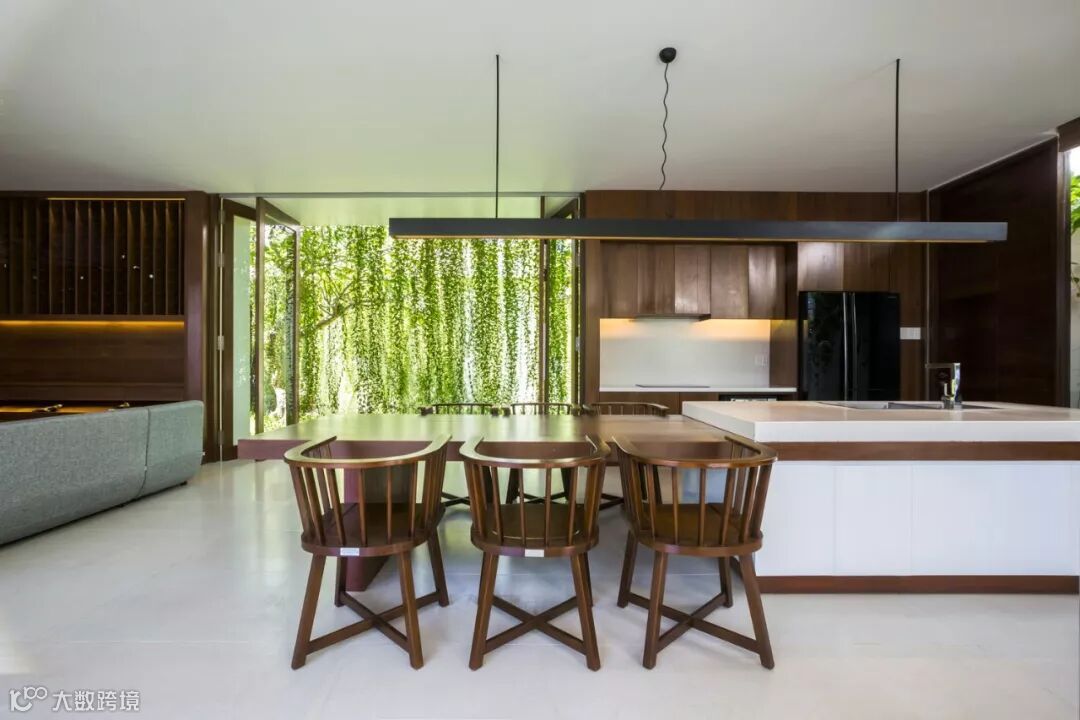 这座现代风格的房子位于胡志明市狭窄的小巷内,设有餐厅和花园。其网格玻璃幕墙采用抽象几何图案设计,符合柯布西耶的Modulor标度 - 基于人体比例的测量系统。暗色的木制餐桌和椅子摆放在窗户前,正对着绿树成荫的花园。弯曲的花园墙壁覆盖了一个带有更多座位的室外用餐区域,四周都是植被。内部和外部都涂上了均匀的白色,为深色木制家具和植物提供了极简主义的空白画布。