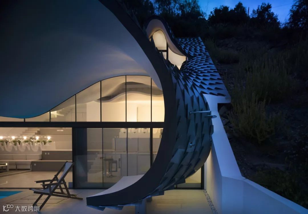 整个建筑由3个部分组成,主屋、客房和一个亭子,这样能减少对环境的影响,屋外设计了一个蓄水池,能够收集灌溉绿植所需的雨水,夏天还能做为游泳池。设计师将其构想为地中海房屋案例研究。作为建筑师的Enric Ruiz-Geli,同时还是一位视觉艺术家,他非常喜欢大自然的几何美学,他把大自然适应性特点应用到建筑中,让人们从设计中获得领悟。