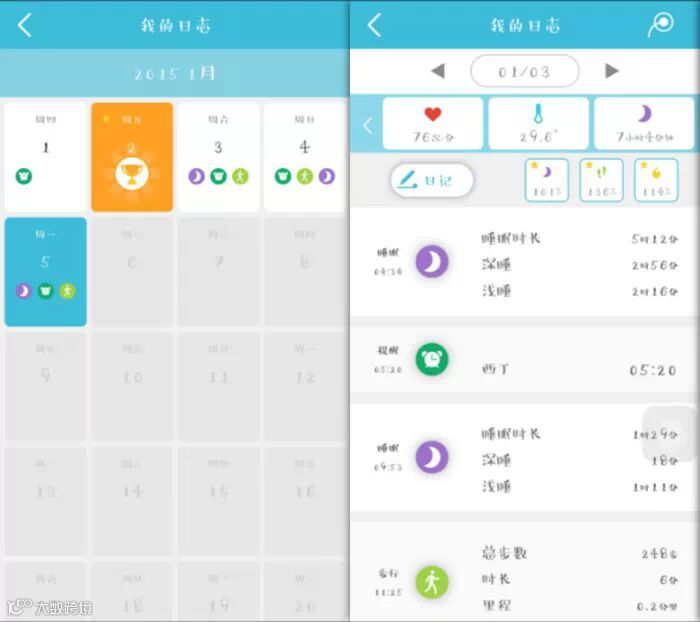 “我的日志”功能让我想到小学生每天的日记,这个功能即是当日所有数据的一个汇总,并且加入了一些虚拟奖励机制,能够一定程度的引起用户关注度,但对于我这种直接无视的人并非起到作用。可以看到这个界面的设计上,将当日的心率、温度和睡眠等数据都摆在最顶端,接着是按照时间顺序排列的活动情况,比如何时睡眠、何时在运动等等,对于了解你当天做了些啥还是有一定帮助的,比起茶余饭后刷刷微博段子,了解下自己的身体情况或许更有用吧。