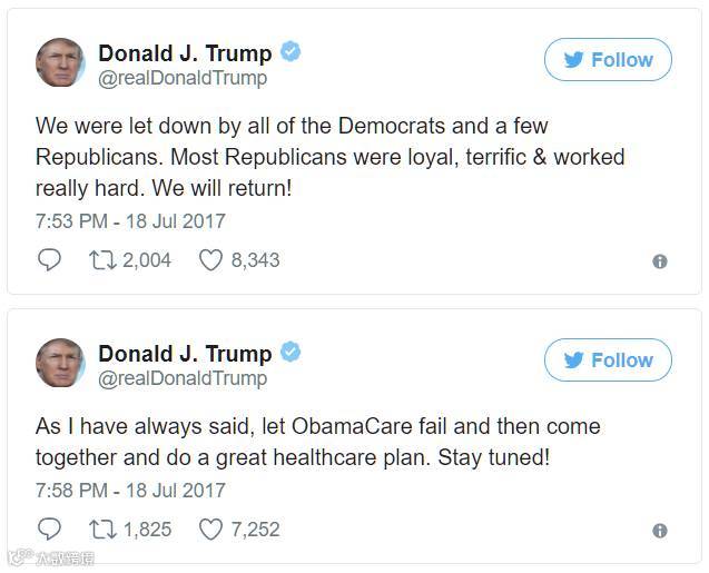 对于共和党在医改议案方面的“后院失火”,特朗普周二早间发布Twitter表示“民主党人和部分共和党人令人失望。多数共和党人忠诚、了不起,也十分努力。我们还会回来的!”