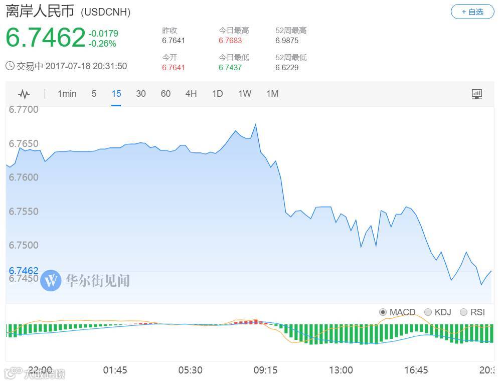 离岸人民币今日早间出现上涨,当前报6.7462,达到逾九个月以来最高水平。