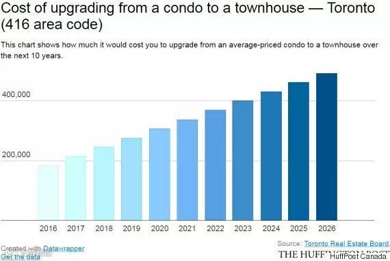 据Huffington Post Canada报道,在多伦多的416区号地区,今年想要把公寓换成镇屋,需要额外的18万3785元。而到了2026年,公寓和镇屋之间的差价将达到49万3055元。
