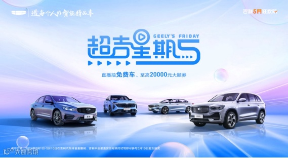 5月1日-5月10日,吉利两大官方抖音直播间倾情献礼,推出在吉利汽车抖音直播间、吉利中国星抖音直营空间预约试驾即可参与抽锦鲤免费车、半价车、至高20000元购车券等超多福利。5月1日-5月6日每晚18:00-21:00,联动全系车型推出“吉利5.1狂欢GO”车系专场直播,5月10日推出“超吉星期五”宠粉整合直播专场,不仅有直播实车讲解,更有30张大额购车券、苹果15手机、NARS礼盒等惊喜福利。
