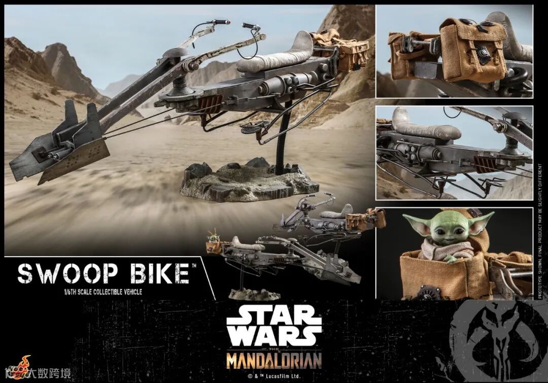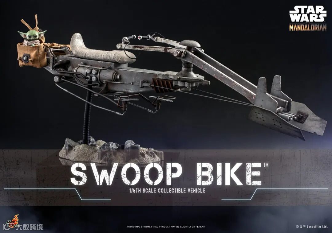 Hot Toys根据《曼达洛人》电视剧按比例制作Swoop Bike — 精细的结构分件制作,机身约长59cm;阔13.5cm;高25cm,银色的车身搭配上车架结构,细腻涂装上淡淡的旧化效果,高度还原载具细节如可调教角度的把手丶踏板丶引擎及襟翼组件丶带布纹的白色坐垫丶车尾位置配有两组侧挂布袋,以及一个特别设计荒漠主题地台连可动支架地台。随Swoop Bike 1:6比例珍藏载具将独家配备一个全新雕制丶耳朵随风飘扬的古古 1:6比例珍藏人偶,可放置於Swoop Bike 的两侧布袋内。