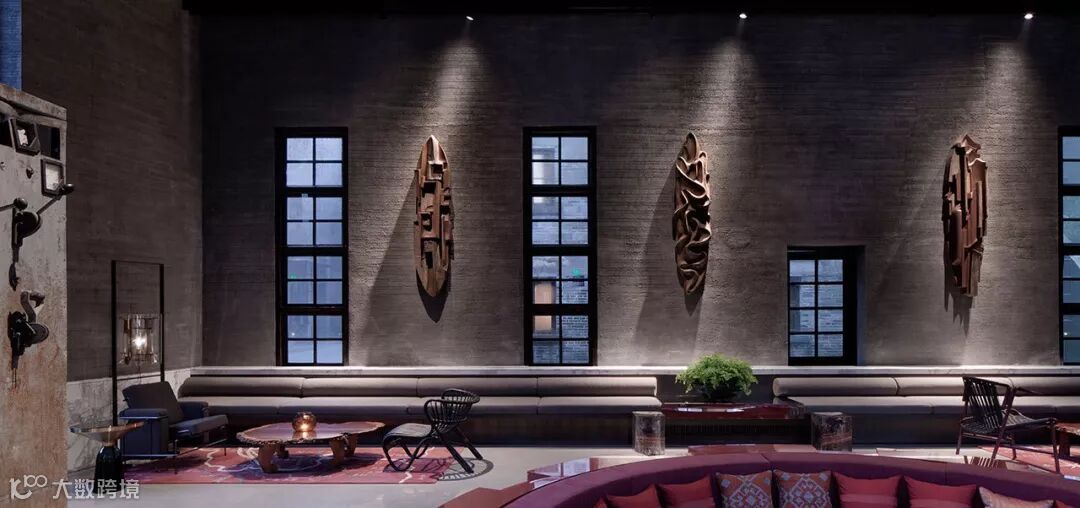 而关于室内空间的设计,糖舍本身有着旧厂房、工业元素,整体力量老的很雄厚。很需要在旧的空间里借当代性去碰撞出新对话,产生新能量。于是有了红大堂、金书吧、蓝酒吧,钢板锈色餐厅……每个空间里都有种强烈的颜色,将艺术性做到极致,与无法大改的老房子形成对抗、达到平衡,变出生机,将记忆海马体内部增益成长期且更加有趣的层面。
