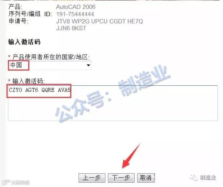 18.选择中国,然后将注册机中的第二栏复制到激活码空白处。点击下一步