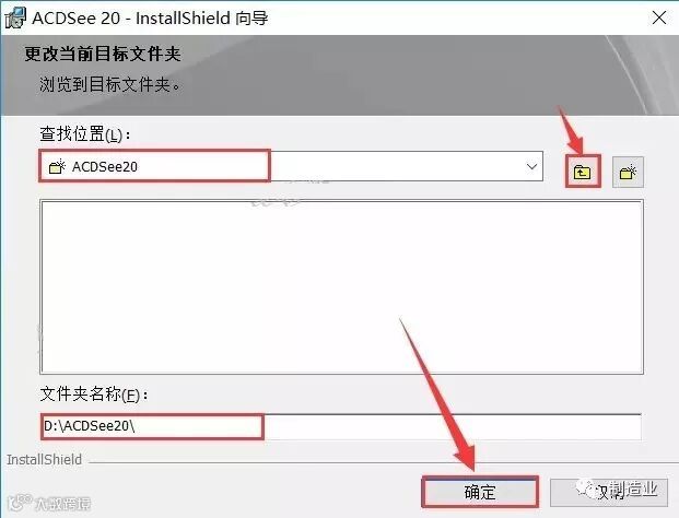 8.点击【文件夹】图标选择安装路径,建议安装在除C盘之外的其它磁盘,可以在D盘或其它盘新建一个【ACDSee20】文件夹,然后点击【确定】。