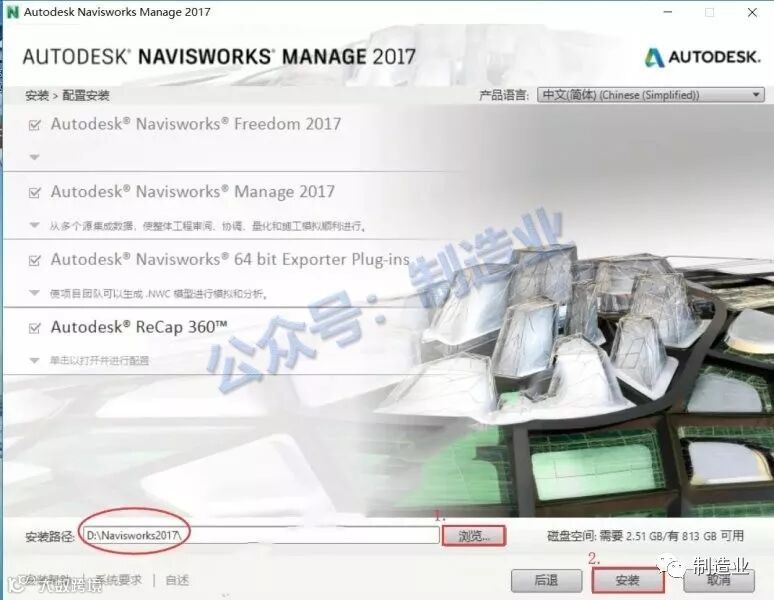 9.点击【浏览】更改软件的安装目录,建议安装在除C盘之外的磁盘,可以在D盘或其它盘里面新建一个【Navisworks2017】的文件夹,然后点击【安装】。