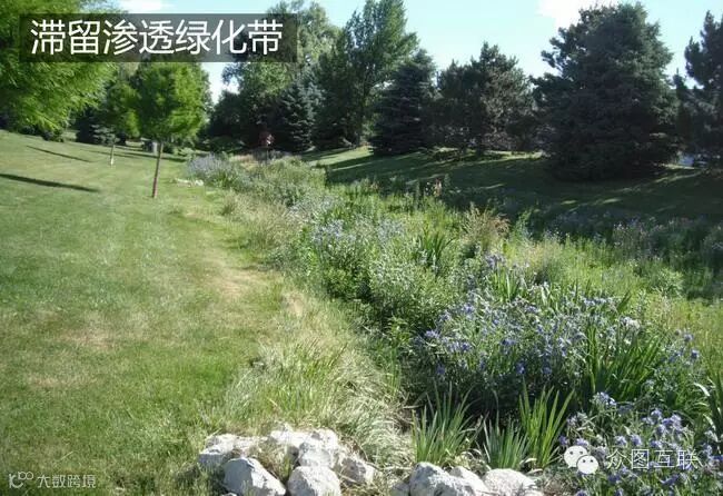 和雨水花园具有相同功能的措施还有生态滞留区。但较前者不同的是,生态滞留区土壤对于工程技术要求相当严格,对于土壤和工程排水结构也都有明确的要求,并且根据位置的不同可分为生态滞留带、生态树池、生态滞留池等。如同下图街边生态滞留区,通过对街豁口将路面径流引流至收水区进行蓄留。