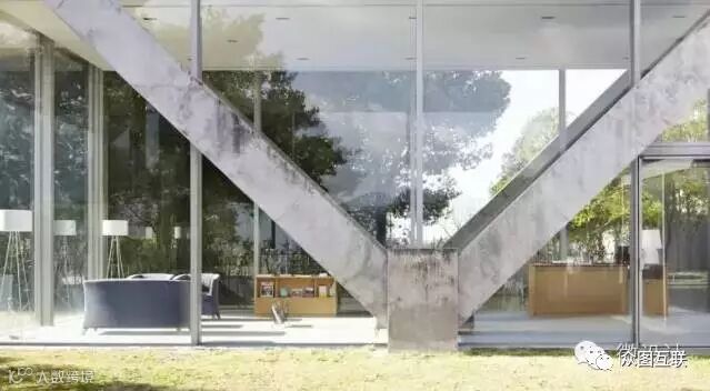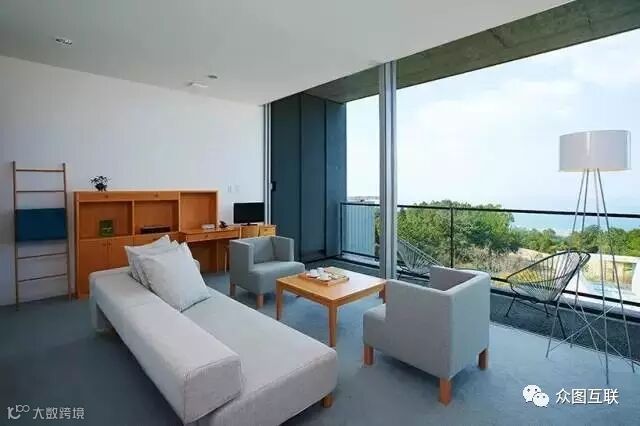 从落地玻璃窗即可从室内欣赏到水池的景观,