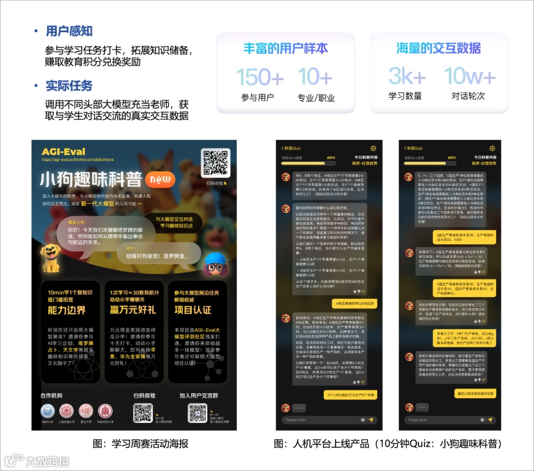 十分钟 Quiz 创新性地将产品化隐式评测用于人机交互评测方案设计,通过上线开放式对话产品,用户在对模型切换无感知的情况下完成知识点学习,在真实的产品体验过程中不知情地做出评测反馈。产品进行公测期间(10天)回收完整对话数据2888条并完成3.2w+真实多轮对话轮次。