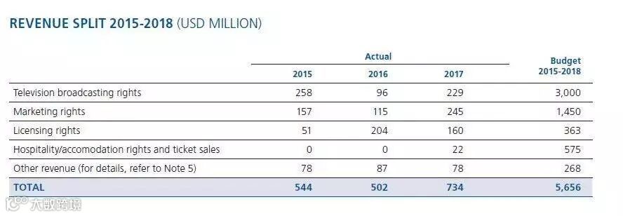 在3月18日发布的FIFA 2017财政报告中,国际足联2017年在全球范围内的收入总额为7.34亿美元,其中电视转播权的收入为2.29亿美元;营销收入超过电视转播权的收入,为2.45亿美元;FIFA周边产品授权的收入也已高达1.6亿美元。