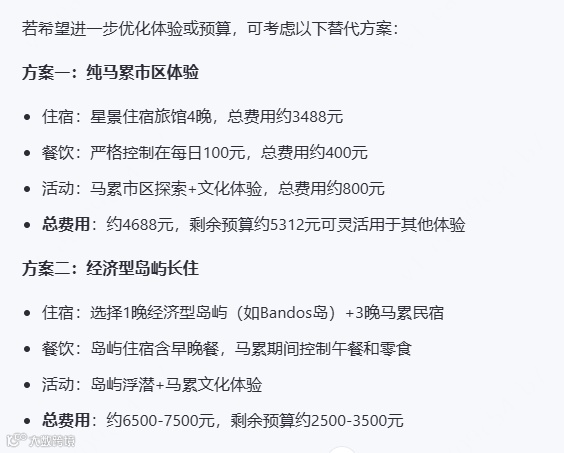这个 case 旨在测试 Qwen3 的规划能力,测试它是否可以满足用户的生活情景需求。生成的旅行攻略基本满足用户需求。可以作为大致参考,需要借助 App去验证。经验证模型的回答存在幻觉:航班、酒店信息和价格不存在,没有考虑到实际因素,五一节假日期间是机酒价格高峰,只是按照要求'1万元以内'做出的计划,但与实际航班信息不相符,价格信息也不准确,一趟从上海飞往马尔代夫马累市的机票价格就在2600~11200元之间,只是围绕要求的合理性,由于临期价格出现较大波动,而未参考实际性,存在模型幻觉。对 P人比较友好,可以节省一些时间去做list;但对于 J 人来说,它只是个参考,每一项内容都需要核对,并进行个性化调整。
