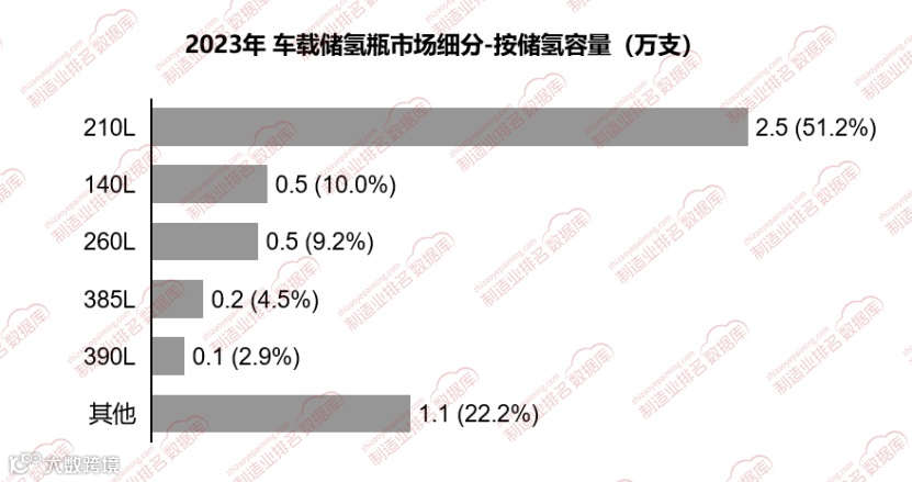 从装机储氢瓶容积规格来看,国内实现上牌装机的储氢瓶容积规格超过20种,其中210/140/260L三种规格装机数量较多,分别占比51.2%/10%/9.2%, 目前385/390/410L占比相对较小,未来容积规格装机数量将会快速增长。
