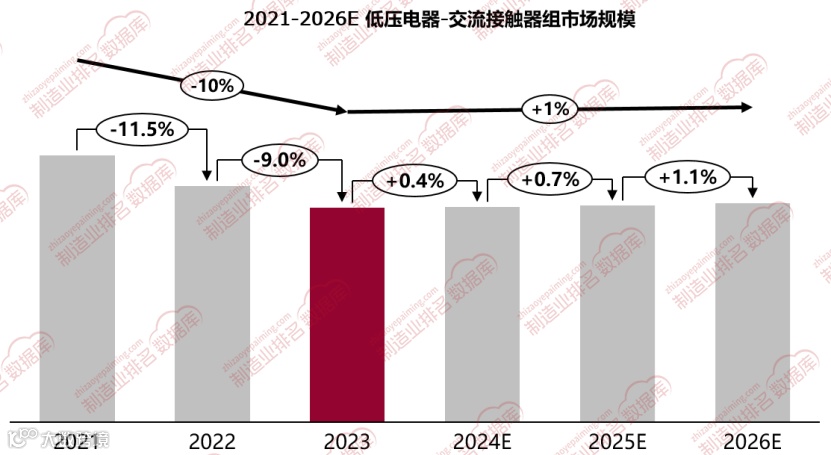 2023年,低压电器交流接触器组市场规模为110+亿元,同比下滑约9%。由于产品主要应用在工业OEM行业,而2023年工业OEM行业中建筑相关OEM领域市场受到民建行业下行影响持续承压,传统机械表现也相对较差,仅部分潜力型OEM领域表现相对较好。