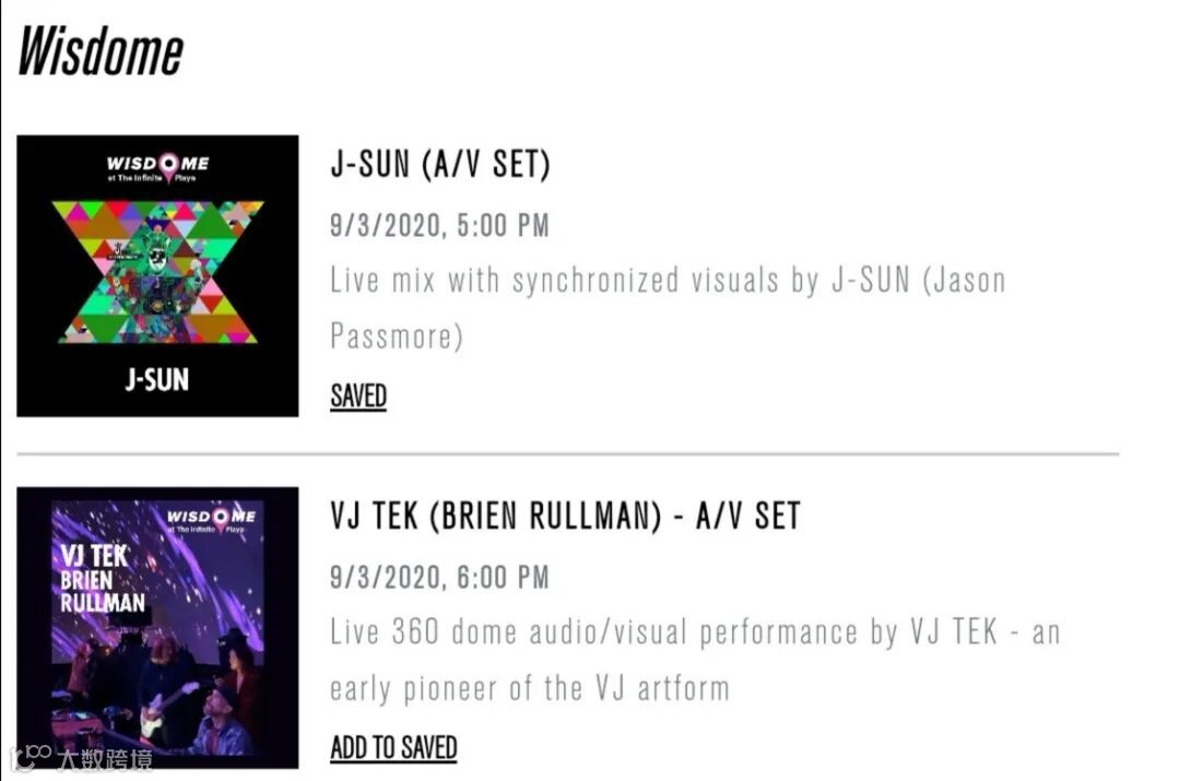 直播活动一直持续到北京时间9月7日,以下每个直播中均在Wisdome大型多媒体球幕产生举行,搭配Fulldome.pro投影系统、影片内容和VJ系统等,创造不同氛围的活动和场景。