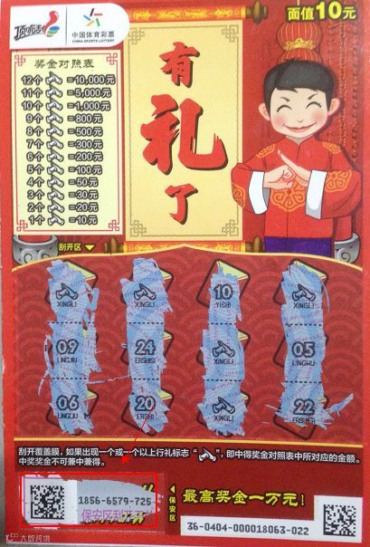 “有礼了”彩票是经财政部和彩票中心批准发行的。属于中国体育彩票,是一种专设彩种。每注的投注金额为10元,奖金10元-1万元不等。最高奖金1万元 即刮出12个行礼标志。最低奖金为刮出一个,奖金10元。