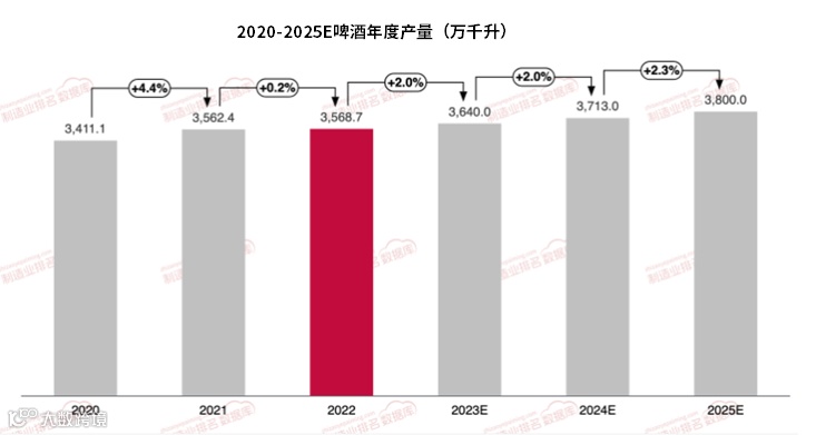 2022年啤酒产量为3568.7万千升,同比2021年增长0.2%,增长幅度较小,预测2023年啤酒产量为3640.0万千升,同比2022增长2%。