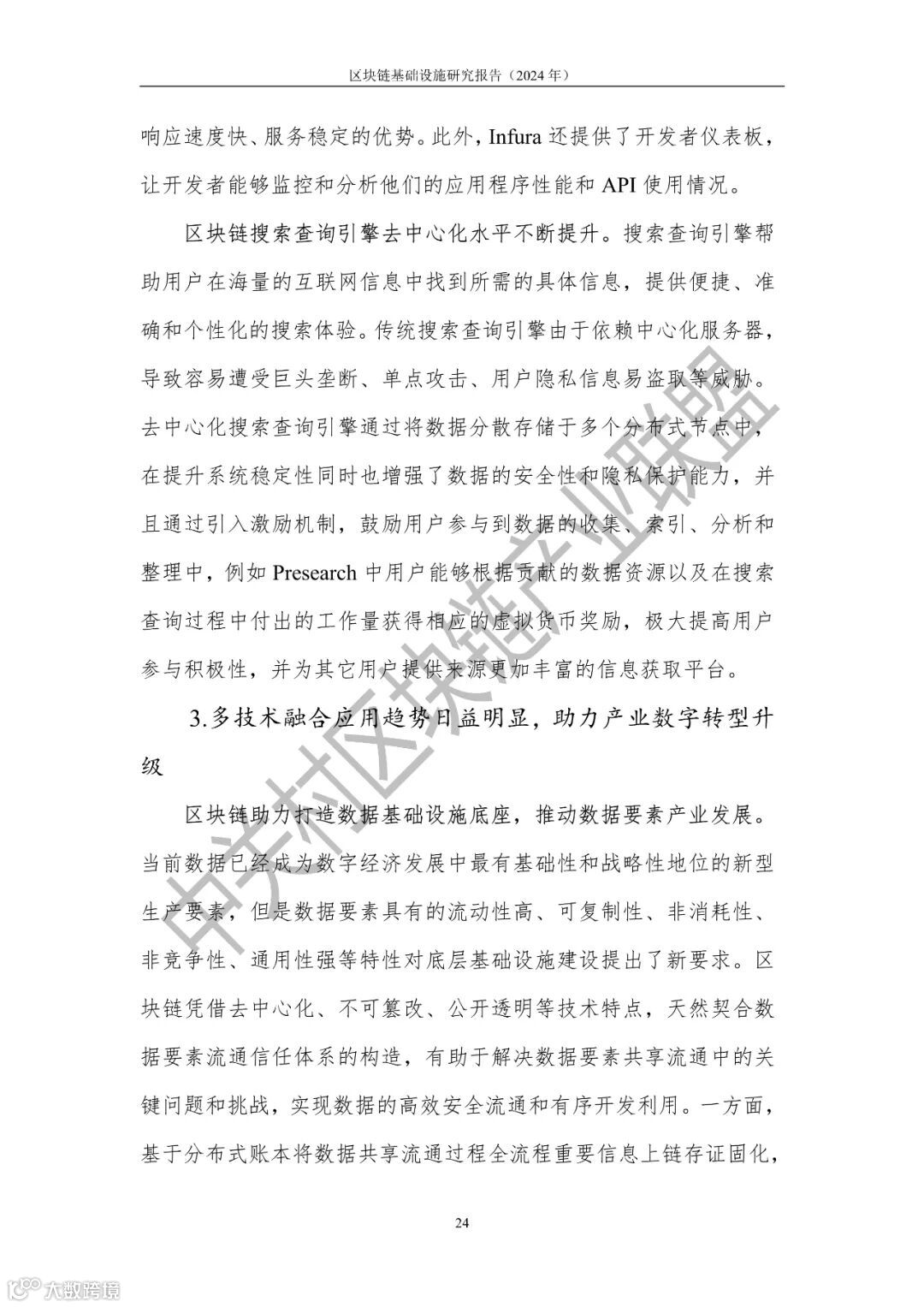 由中关村区块链产业联盟指导,中国信息通信研究院牵头,西安交通大学、欧科云链控股有限公司、布比(北京)网络技术有限公司参与编写的《区块链基础设施研究报告(2024年)》正式发布。本报告概述了区块链基础设施在2024年的总体发展态势,剖析了区块链基础设施在技术革新、产业生态、监管合规等方面的进展。
