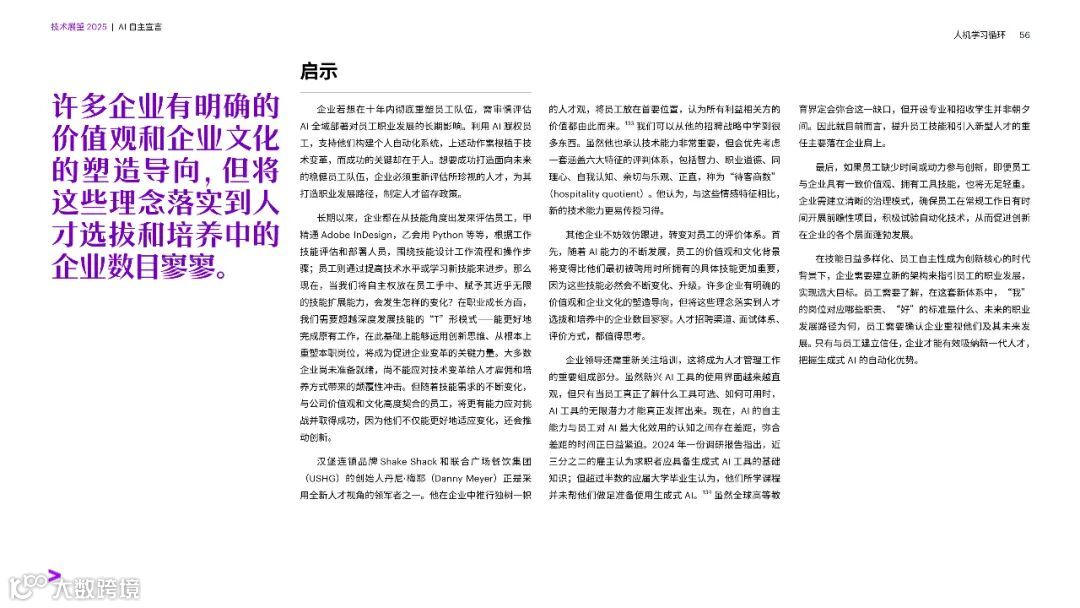 《技术展望2025》是由埃森哲公司发布的关于未来技术发展趋势的报告,重点关注人工智能(AI)的自主性及其对企业和社会的深远影响。报告认为,AI的普及将为企业带来无限的创新和增长机会,同时也带来了新的挑战,尤其是信任的建立。报告围绕AI自主性的发展,探讨了其在技术开发、客户体验、物理空间和工作组织四个维度上的商业转型和信任重塑。