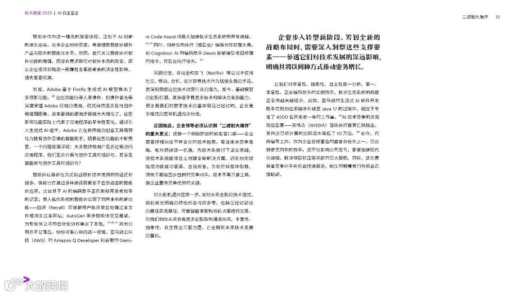1. 二进制大爆炸:基础模型的创新推动了软件工程和数字生态系统设计的根本性变革。智能体系统将成为数字生态系统的主要用户,企业需要构建可组合式数字核心,以支持智能体的自主性和抽象性。