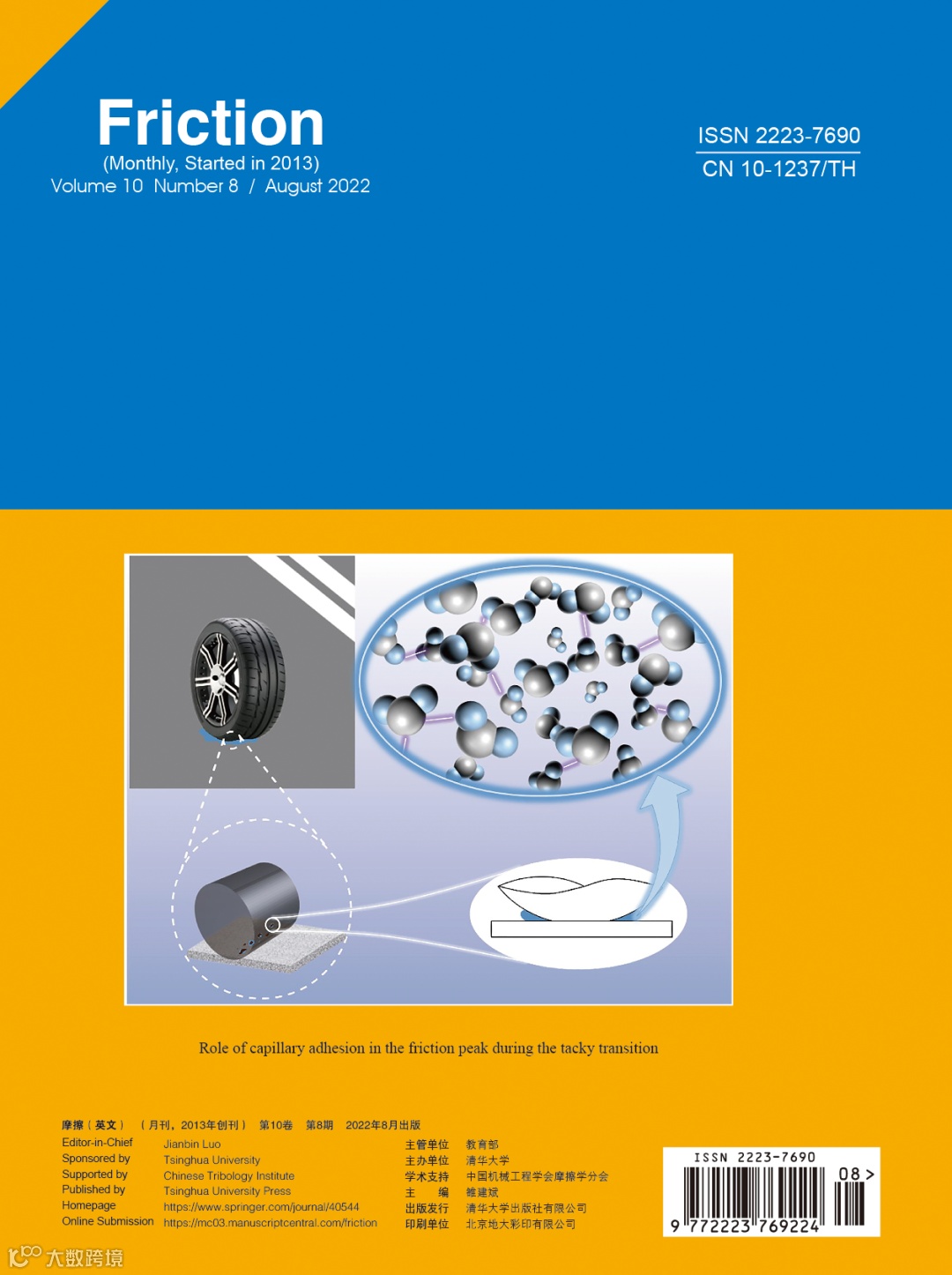 《摩擦(英文)》(Friction)是清华大学主办的国内首个摩擦学领域国际学术期刊,旨在发表和出版涵盖接触、摩擦、磨损、润滑、表面粘着和界面科学跨学科的创新性研究论文及专题性综述文章,致力于为国内外摩擦学和表面界面科学领域的学者搭建一流的国际学术交流平台,促进摩擦学在中国和国际学术界之间的交流和发展。其2020年影响因子为6.167,在国际摩擦学领域15余种SCIE数据库收录期刊中排名第一,成为我国乃至亚洲首个进入全球机械工程领域前10名的国际学术期刊(大类学科排名前8%)。2019年入选“中国科技期刊卓越行动计划”领军期刊(全国共22项),2021年荣获“第五届中国出版政府奖期刊奖提名奖”,2022年变为月刊,年发文量120篇,在Springer平台和SciOpen平台同时完全开放获取出版。