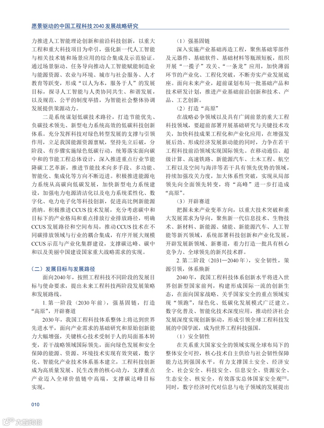 发展目标与发展路径第一阶段(2030年前),强基固链,打造“高原”,开辟赛道。2030年,我国工程科技体系整体上将达到世界先进水平,面向产业需求的基础研究和原始创新能力大幅增强,关键核心技术受制于人的局面基本转变,若干战略领域国际领先,面向绿色发展和安全保障的能源、资源、环境技术实现有效突破,数字化、智能化产业技术体系基本建立,工程科技创新成为高质量发展、民生改善的核心动力,支撑重点产业迈入全球价值链中高端,支撑碳达峰目标实现。