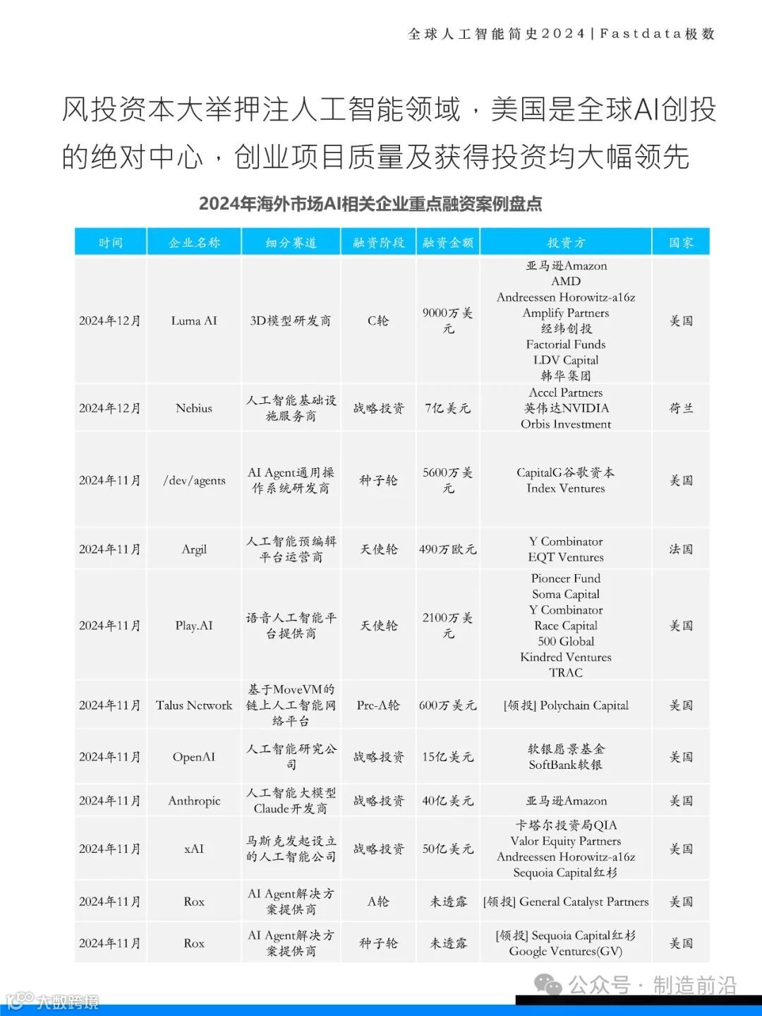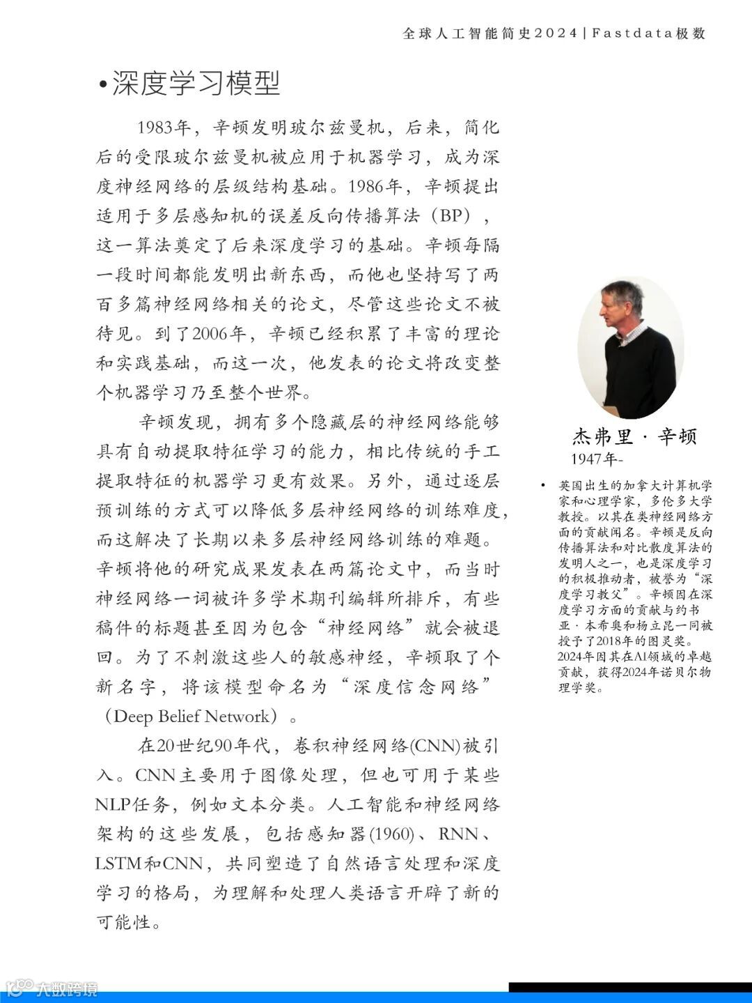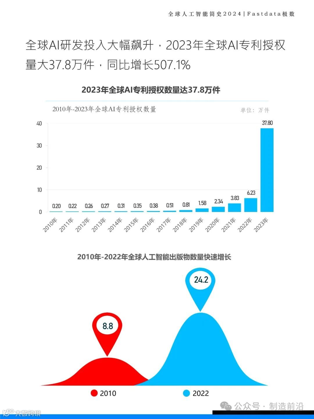 《2024全球人工智能简史》报告概述了人工智能的发展历程,强调了大型语言模型的演变和影响,预测了人工智能市场的快速增长,指出了人工智能工具的普及和企业对AI应用的接受度,同时分析了AI在提高工作效率和创造就业机会方面的潜力。报告还强调了人工智能项目实施中的挑战,特别是数据质量和模型优化问题,并展望了生成式人工智能的兴起及其对未来工作流程、多模态交互和虚拟代理的影响,同时提醒了监管、版权和道德问题的重要性。