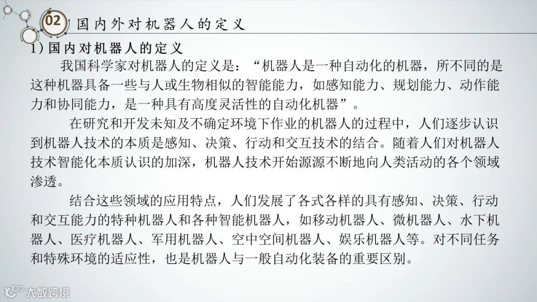 我国科学家对机器人的定义是:“机器人是一种自动化的机器,所不同的是这种机器具备一些与人或生物相似的智能能力,如感知能力、规划能力、动作能力和协同能力,是一种具有高度灵活性的自动化机器”。