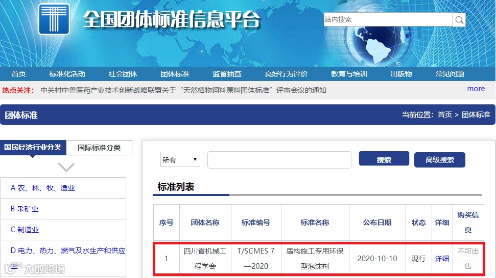 由中铁工服、四川润得久科技有限公司、成都三新化工应用技术研究所联合起草的国内首个《盾构施工专用环保型泡沫剂》(标准号:T/SCMES 7-2020)团体标准历时三个月,先后通过专家组论证、评审,最终由四川省机械工程学会在“全国团体标准信息平台”发布并正式实施。
