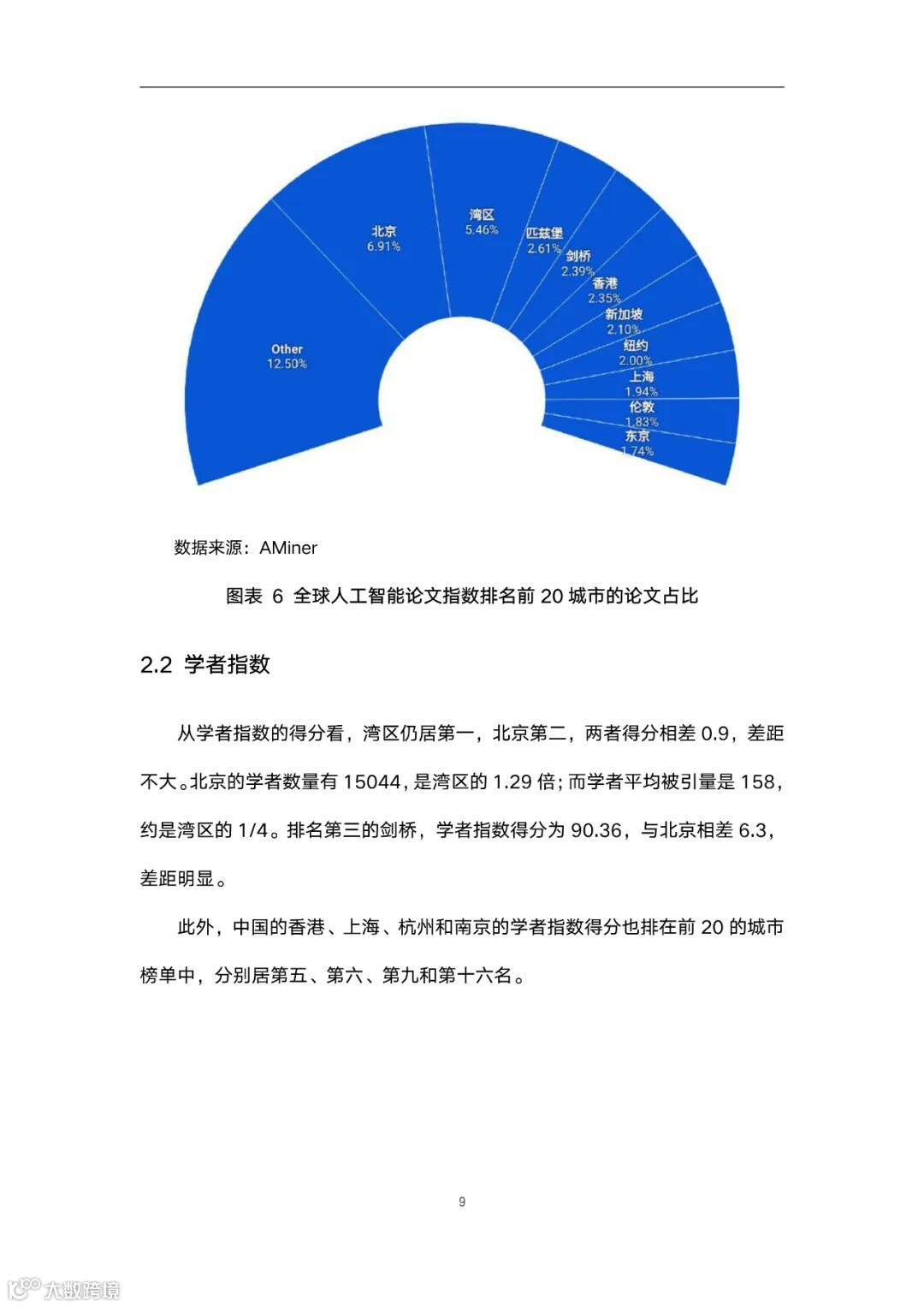 通过对创新指标分析得出,北京的创新指数位列全球前十,排名全球第二。在论文、学者、机构和国际合作四个维度的得分中,北京居全国首位。香港、上海、杭州、深圳和南京的综合得分进入全球前二十,表现也十分亮眼。