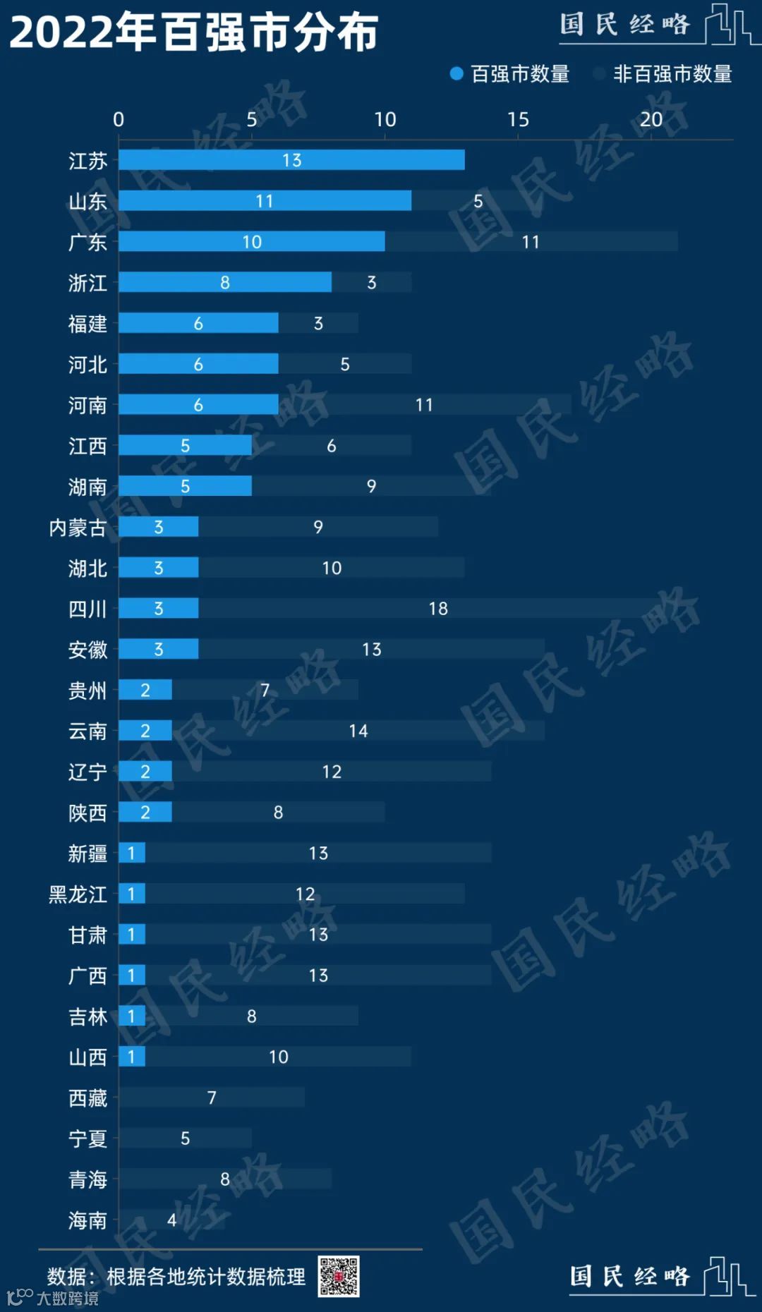 以入围城市数量来看,江苏、山东、广东、浙江各有13市、11市、10市、8市跻身百强。