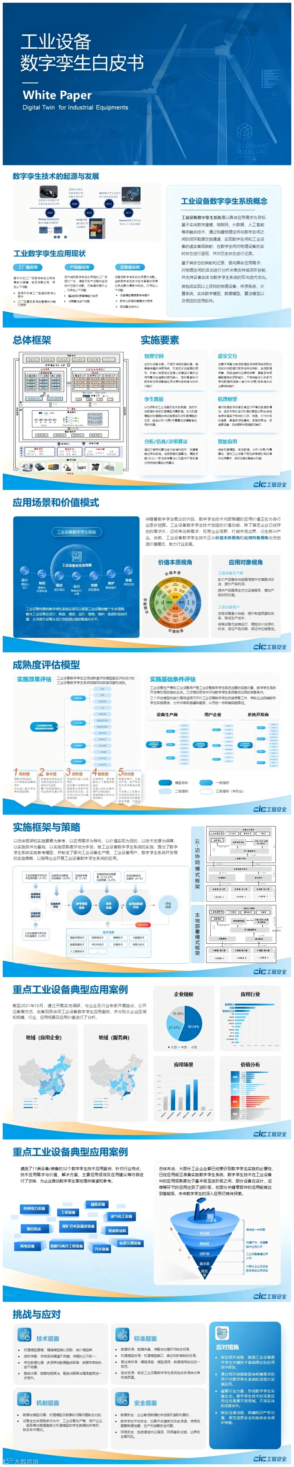 国家工业信息安全发展研究中心发布了《工业设备数字孪生白皮书》。该白皮书系统介绍了数字孪生的起源、发展和工业应用现状,从实施要素维度提出工业设备数字孪生的总体框架模型,针对工业设备数字孪生实施中面临的痛点问题,从工业设备系统生产商、用户、工业设备数字孪生系统开发商等视角研究提出工业设备数字孪生系统实施成熟度评估模型,为评估工业设备数字孪生系统的实施准备和成效提供了方法论,围绕数字孪生在不同行业应用场景提供了风电设备、工程装备、数控机床等11类设备、32个数字孪生典型案例。