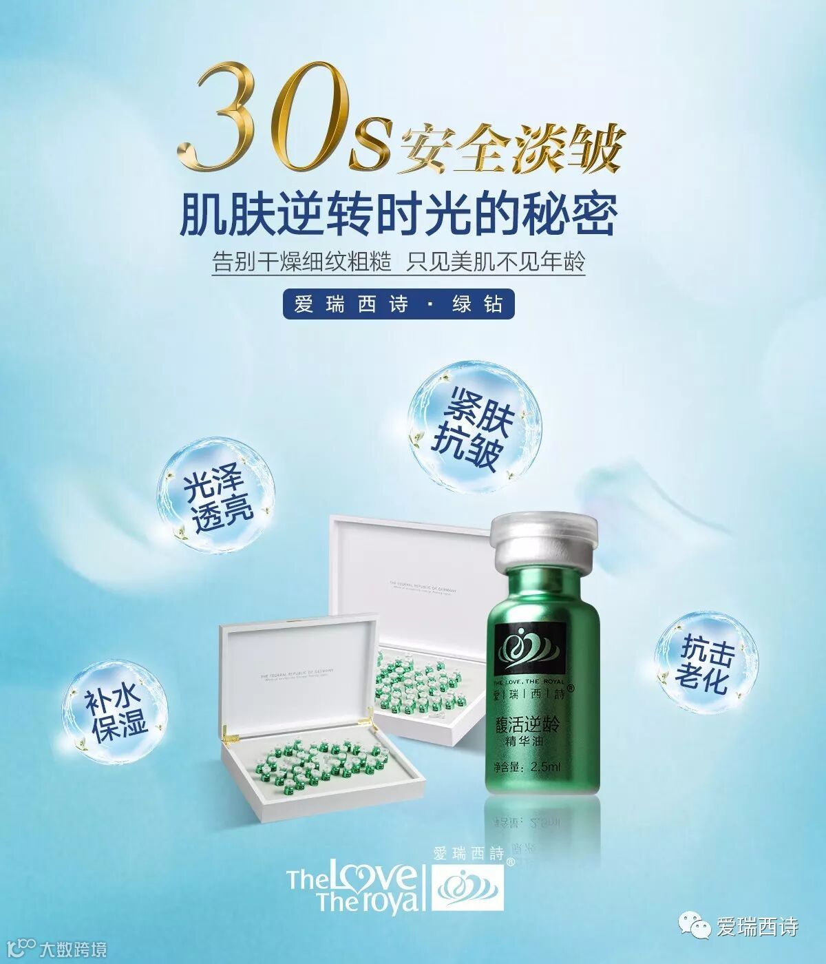 爱瑞西诗馥活逆龄精华油,一涂一抹,轻松三十秒,细纹消失不见。抗衰,比你想的更加简单,你不用承担任何风险,也不用先经历一段很痛苦的阶段,却可以真正健康安全的实现逆龄青春。