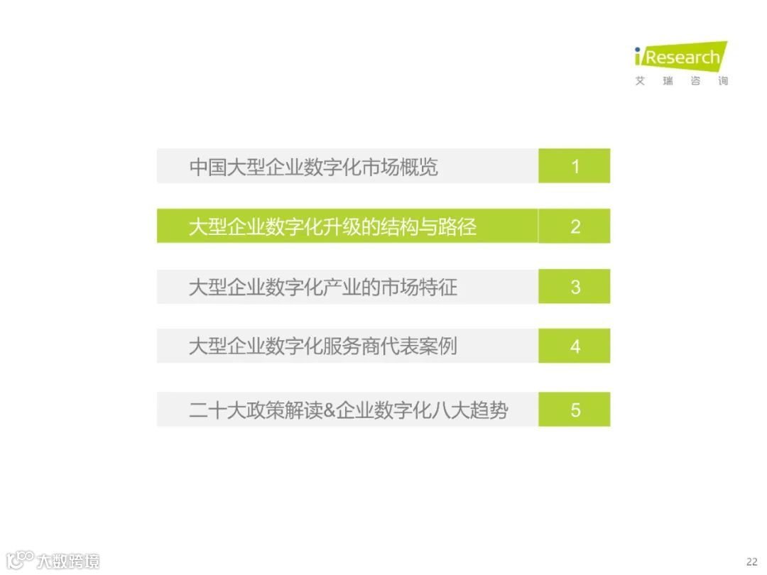 艾瑞咨询发布《2022年中国大型企业数字化升级路径研究》。本报告聚焦国内大型企业的数字化转型市场,报告第一章从实证角度综述我国大型企业数字化市场,并分析了各行业大型企业近年来的主要数字化战略;报告第二章结合单个企业内部数字化发展的步骤和数字化产业演化的整体路径,对国内大型企业开展数字化转型升级的方式、路径和结构进行了解析;报告第三章列举了大型企业数字化市场的代表性特征,以及对市场形态和行为的影响;报告第五章结合二十大政策,对我国企业数字化市场未来发展趋势进行了展望。