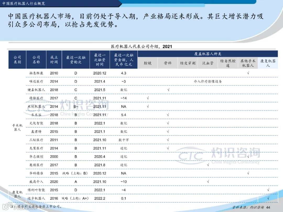 CIC灼识咨询基于大量一手及二手研究,发布了《2022中国机器人行业蓝皮书》,此蓝皮书从中国机器人的行业的定义、分类、驱动因素和主要细分行业进行梳理,对各细分行业的应用场景、市场规模、代表公司及其市场份额等方面进行了详细分析。