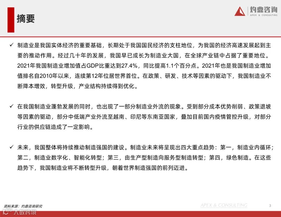 灼鼎咨询发布《中国制造业行业研究报告(2022)》,分析了中国制造业现状、驱动因素、外流现象和发展趋势。