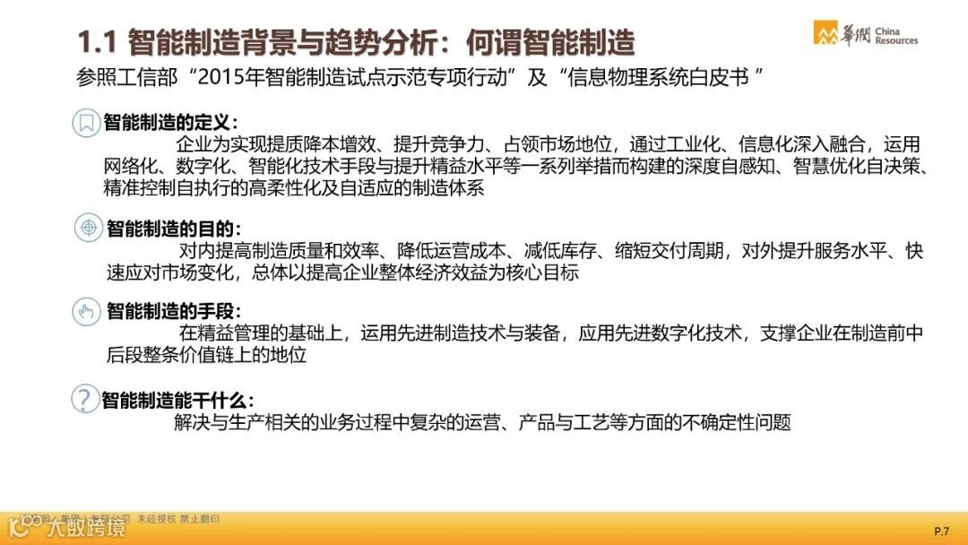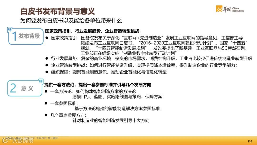 编写思路:紧跟国家智能制造发展政策,面向企业智能制造转型目标,以提升效益为核心驱动,以智能制造发展趋势与环境为大背景,提供一套构建智能制造发展解决方案的标准方法论,提出一个智能制造解决方案参照标准,引导十大重点发展方向,提供一套华润智能制造解决方案与实践分享。