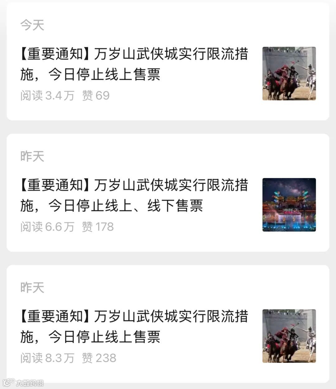 ● 万岁山武侠城连发推文通知游客,景区启动限流措施。图片来源:万岁山武侠城