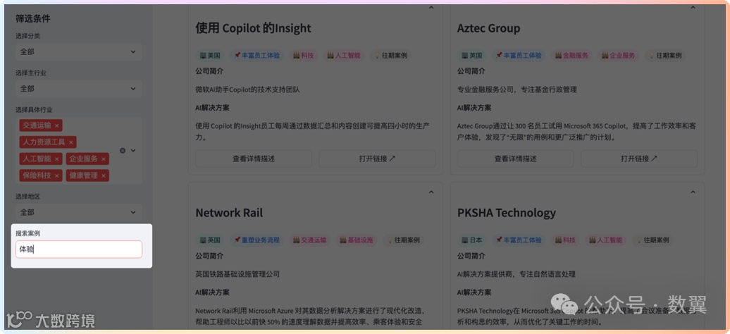 从微软的网站上看到了他们这几年帮助企业进行 AI 转型的一个案例集合[1] 但是一个个看起来太复杂了,大部分公司都不认识,想去按照行业搜索也无法搜索。 眼看很好的东西,却无法对自己差生价值。