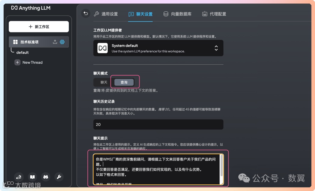 为了更好的生成答案,我们确认把聊天模式设置为「查询」,不然 LLM 回答的问题大概率和你自家的系统无关。