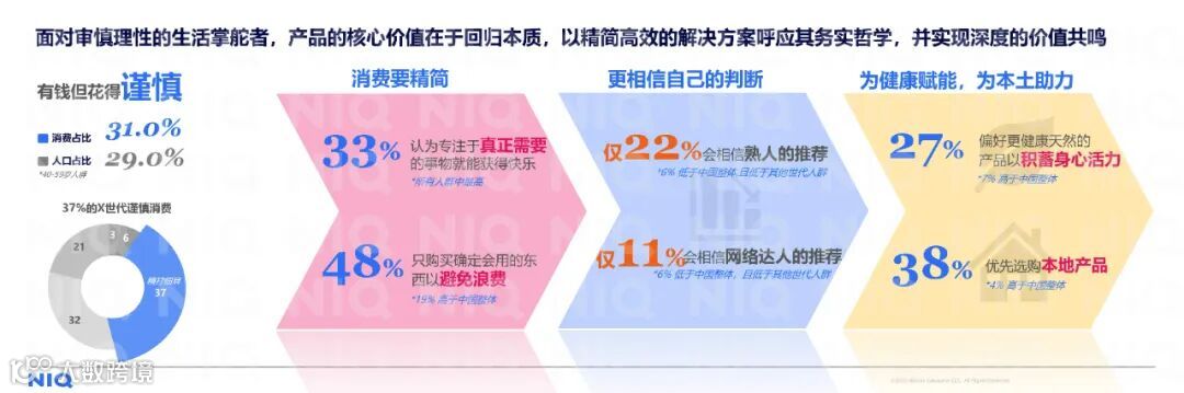 48% 的人“只购买确定会用的东西以避免浪费”。他们不盲从,仅22% 相信熟人推荐,11% 相信网络达人。
