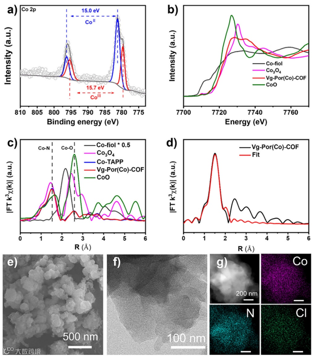 图2. a) Vg-Por(Co)-COF的高分辨率Co 2p XPS谱图。Vg-Por(Co)-COF的Co K边b) XANES与c) EXAFS谱图,并与Co箔、Co3O4及Co-TAPP对比。d) Vg-Por(Co)-COF的EXAFS拟合曲线。e) SEM与f) TEM图像。g) HAADF-STEM图像及相应的Co、N与Cl元素EDS面分布图。